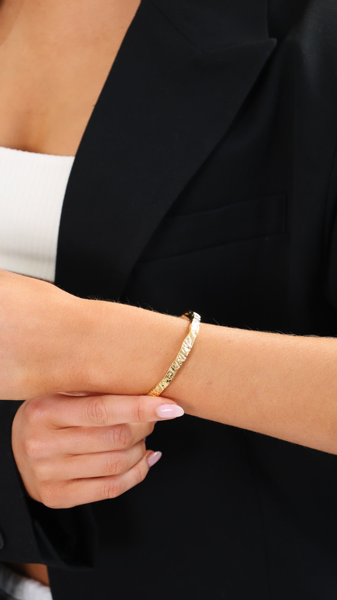 This adjustable, battered style, cuff bangle is lightweight and perfect for transitioning from day to night. The Harper Bangle has a unique curvature that moulds to any part of wrist to elbow. Elevate any outfit with this versatile and trendy accessory.
