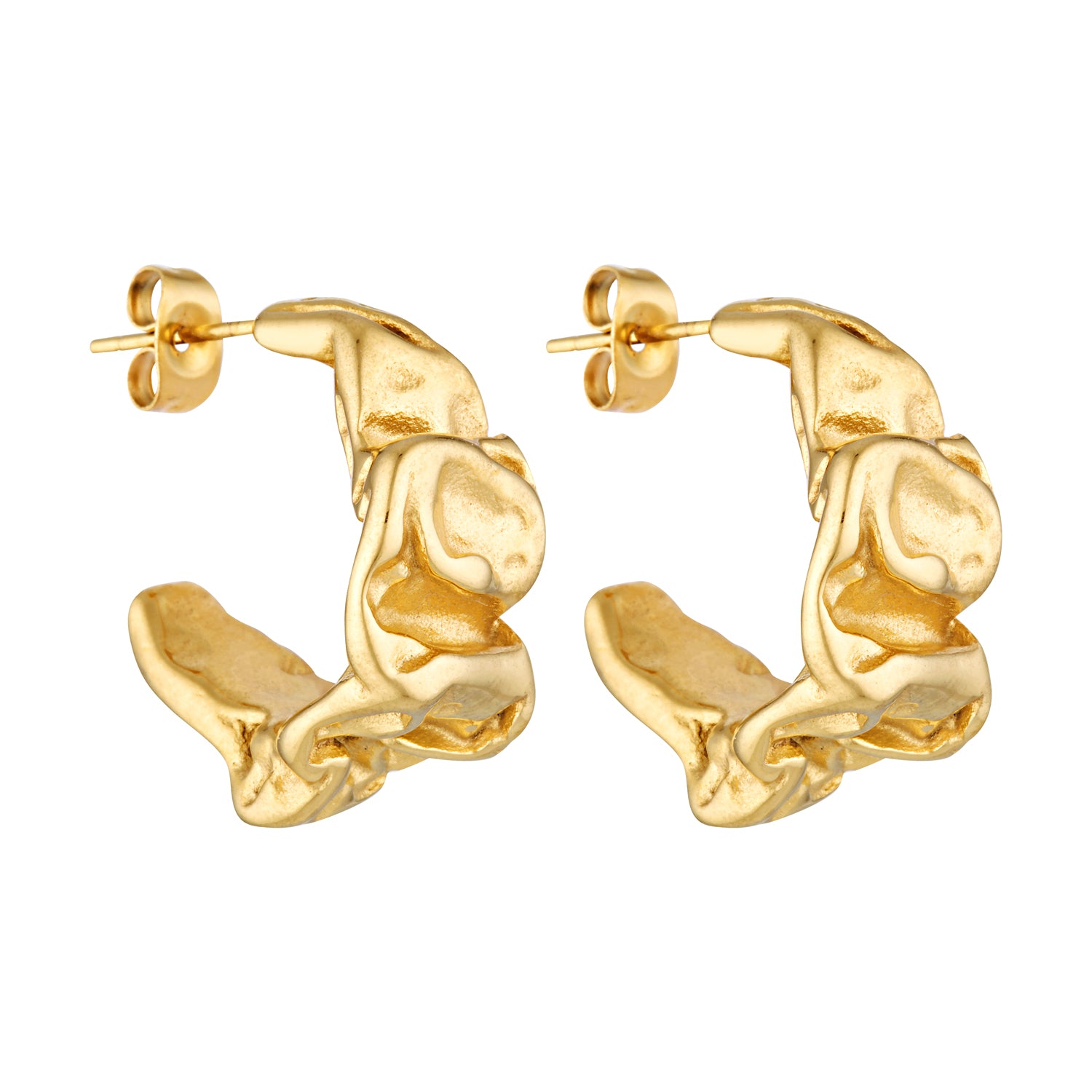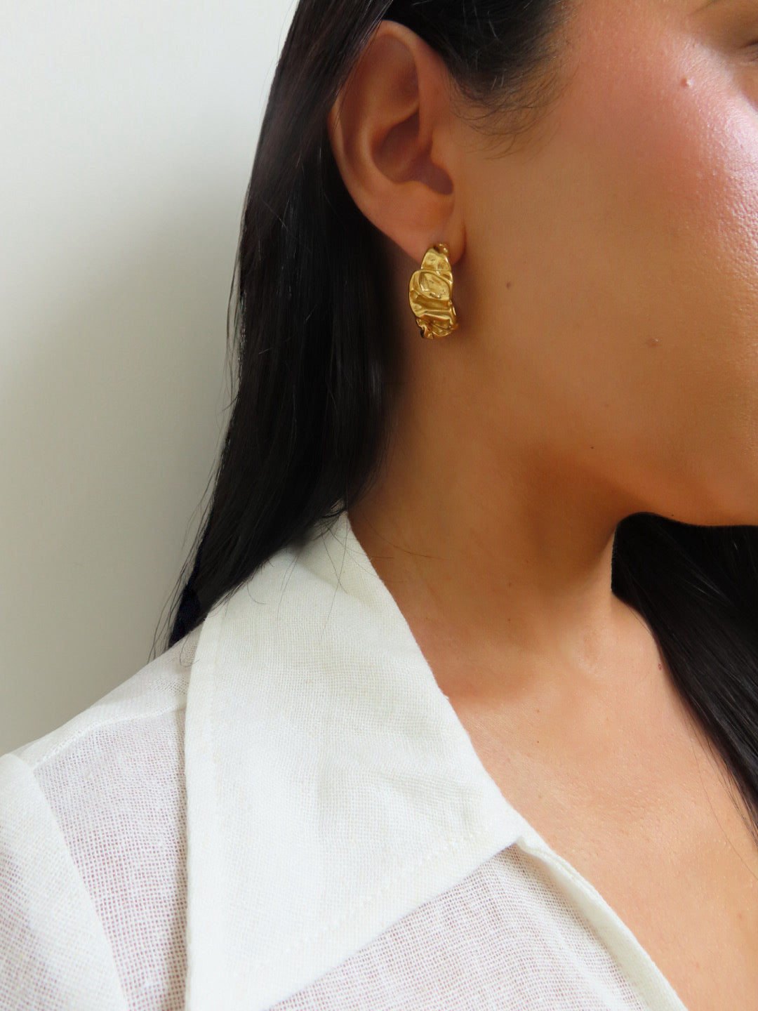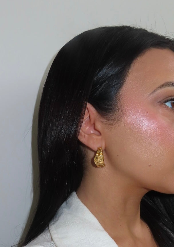 With a unique hoop structure the Nora Hoop boasts a battered edge design. Crafted with a subtly uneven, hand-forged texture that evokes old-world European artistry, each hoop carries the charm of imperfection—like something discovered in a seaside market on the Mediterranean coast. Waterproof and tarnish-resistant, it makes the perfect piece for everyday wear, from rainy cobblestone strolls to sun-drenched escapes.